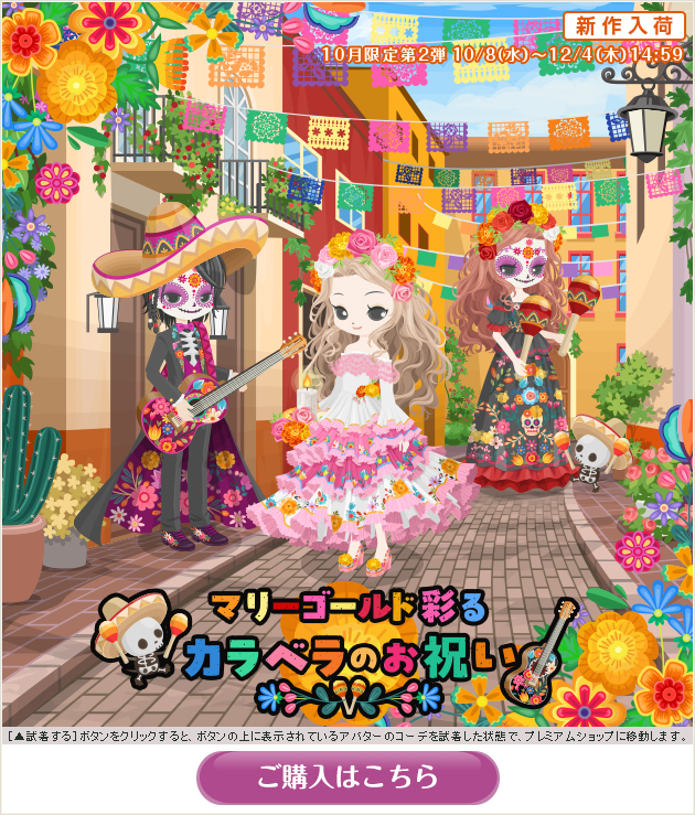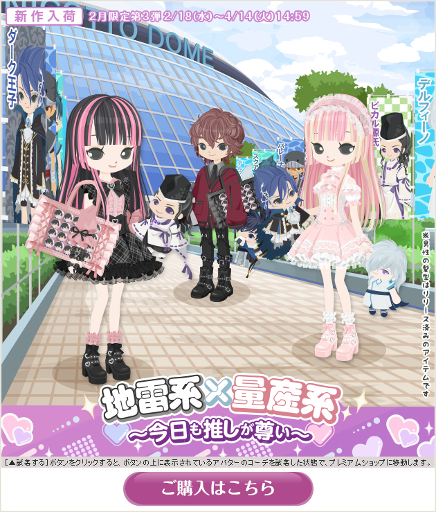 ※画像内のコーディネートには、無料ショップで取り扱っているアイテムや、販売期間外のアイテムが含まれていることがありますので、「このコーデを試着」ボタンをクリックしても、完全に画像と同じコーディネートにはならないことがあります。