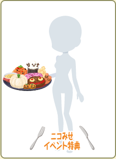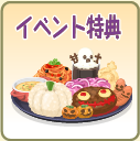イベント期間内に、通常サイズの「不思議な夜のにぎやかプレート」を 2000個販売すると、対象料理のきせかえアイテムがもらえます。